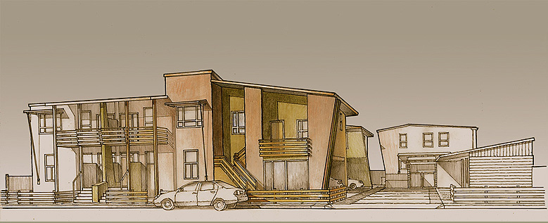 • Several heritage trees will be preserved within the courtyard housing designed for this infill site. Spacious one-bedroom apartments encourage residents to settle into a neighborhood that is an easy walk to beaches and to downtown.